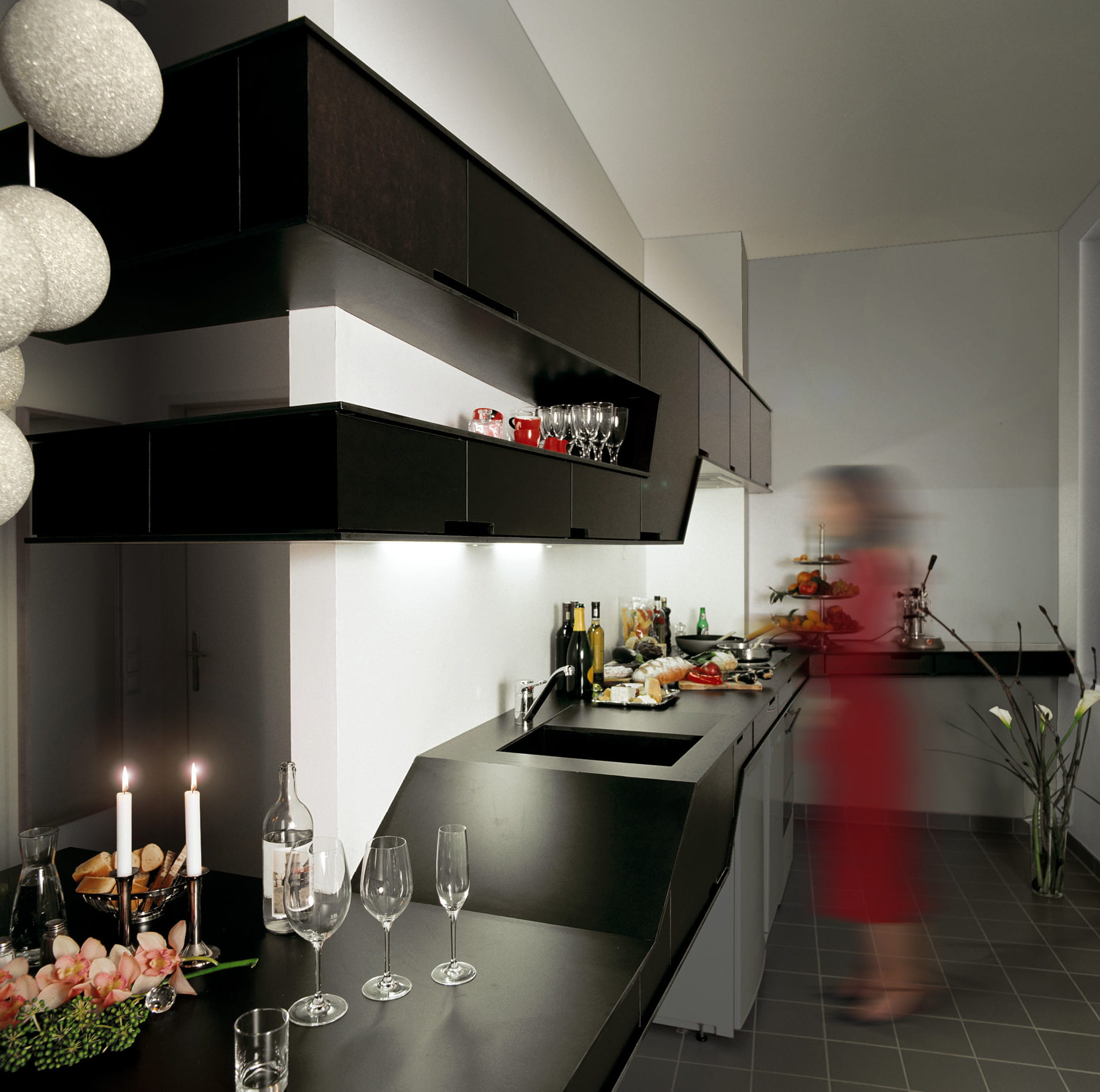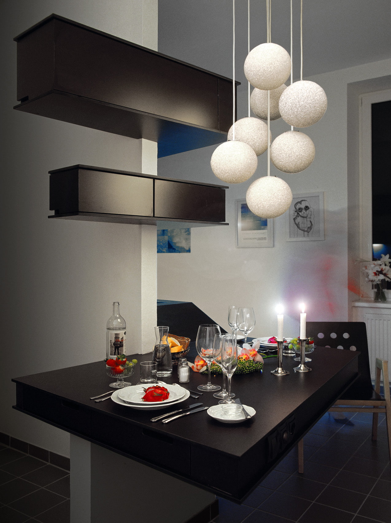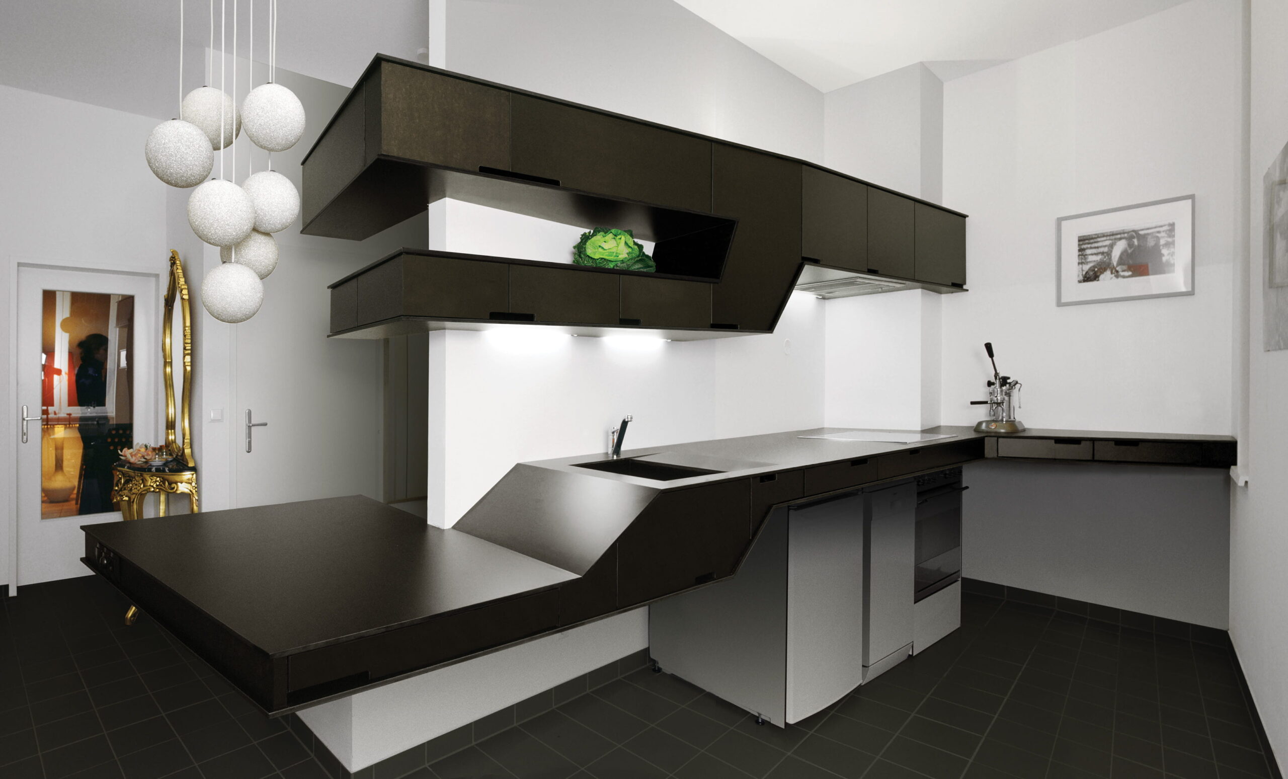Küchenkurve: Die Küche als Skulptur, der Grundriss der kleinen Eigentumswohnung ordnet sich dem Objekt unter. Für einen beengten Küchenraum soll eine geeignete Küche entwickelt werden. Der Raum wird schnell zu klein, die Küche braucht mehr Platz, Wände müssen weichen. In das Küchenmöbel wird ein Esstisch integriert, ein Sound- und Lichtsystem eingebaut. Die Wohnung organisiert sich rund um die Küche.