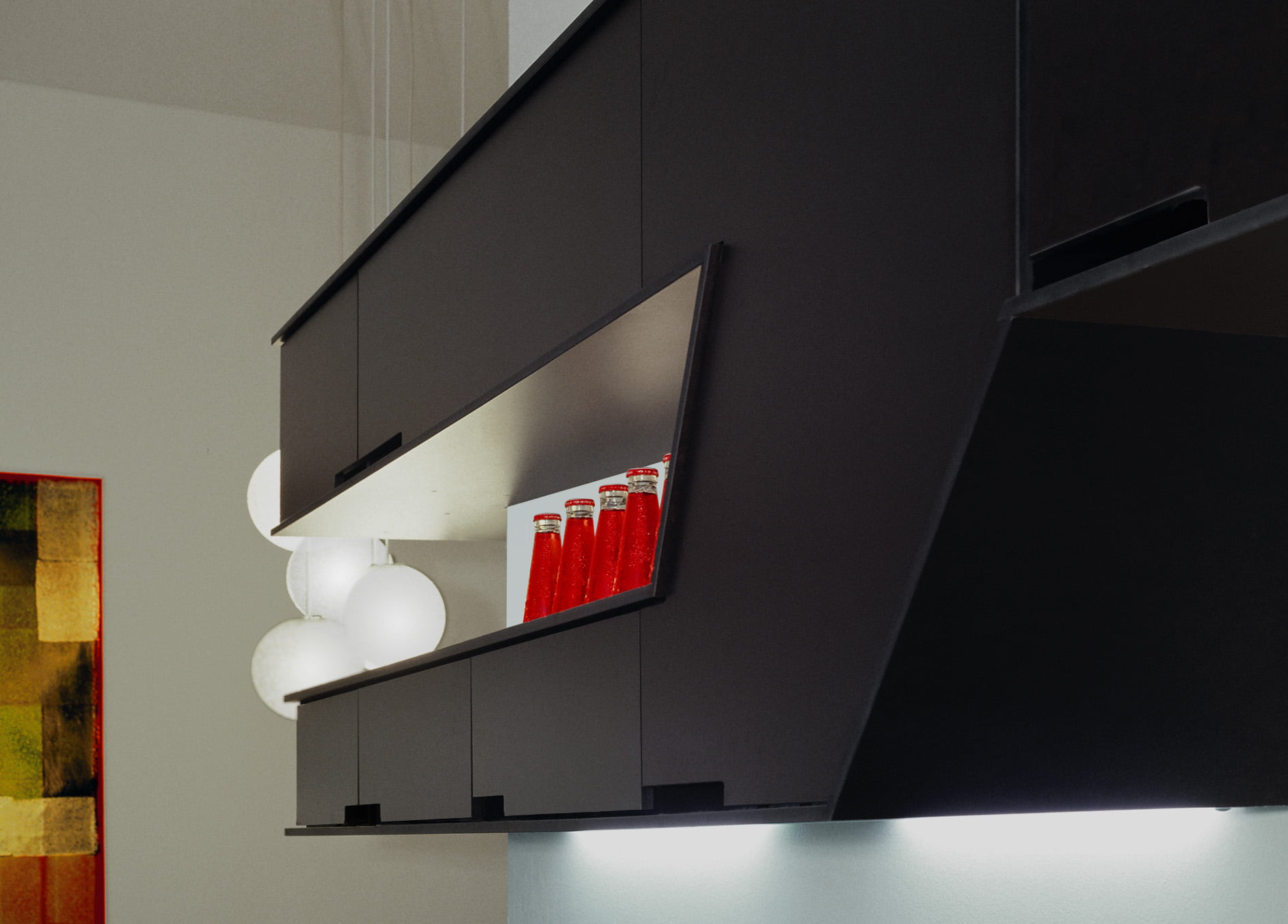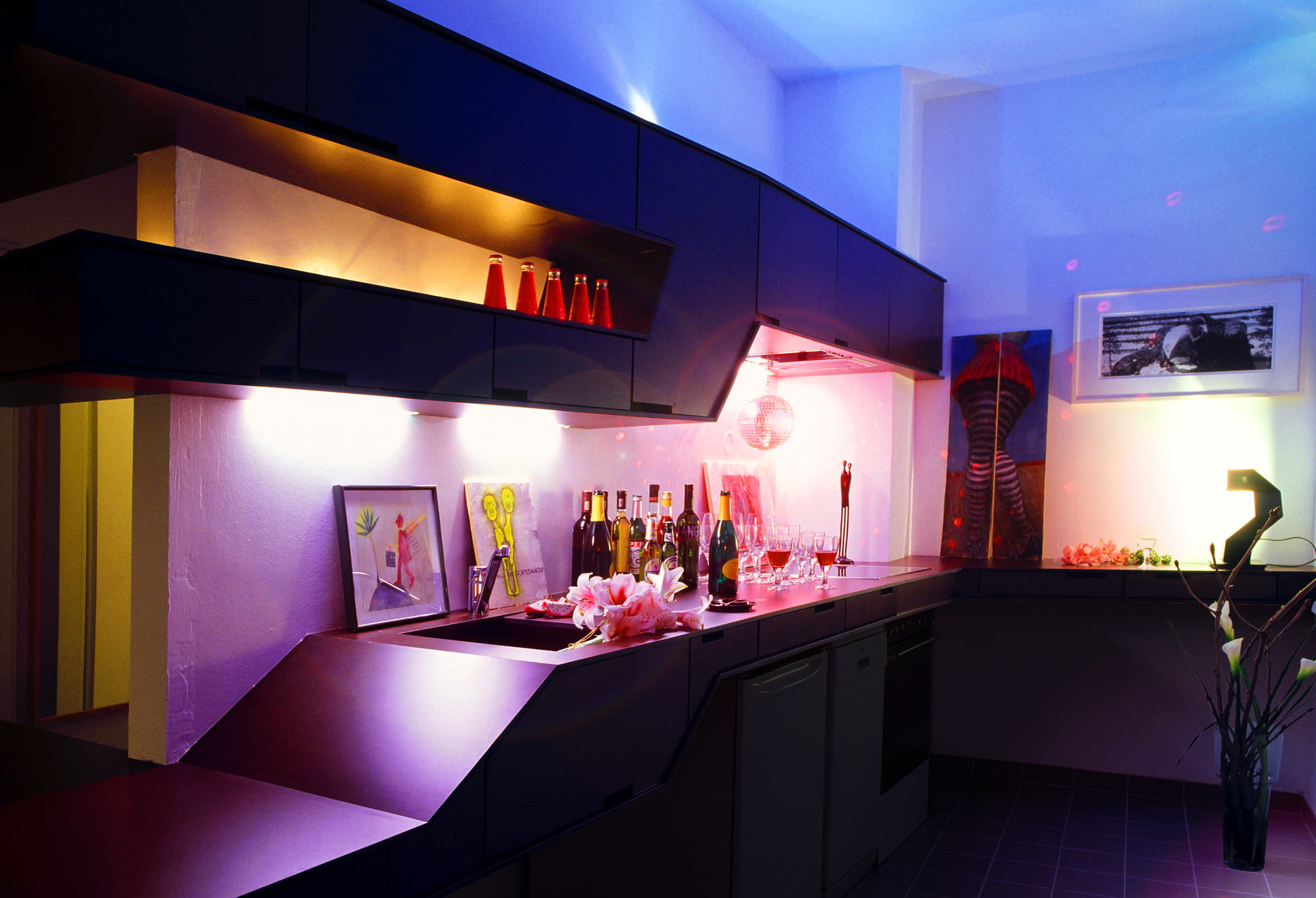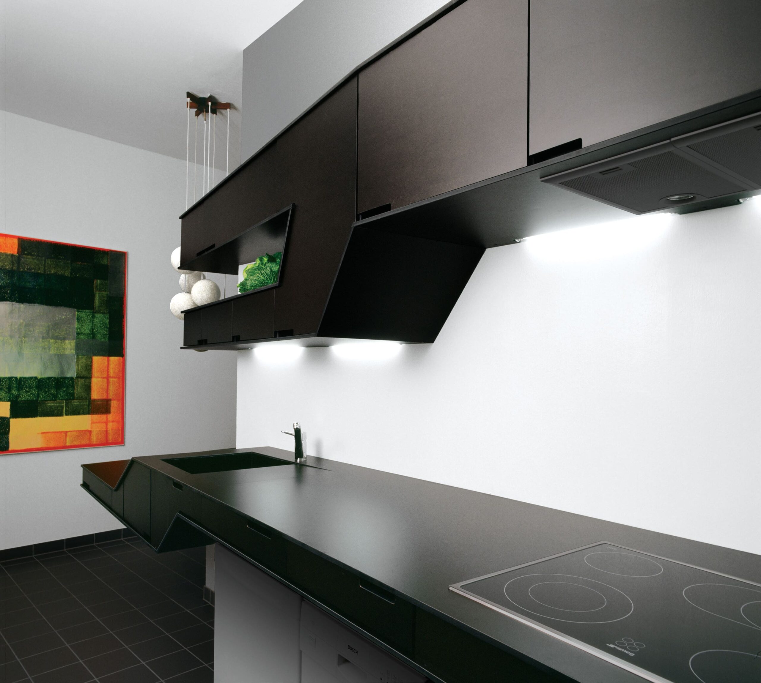 Küchenkurve: Die Küche als Skulptur, der Grundriss der kleinen Eigentumswohnung ordnet sich dem Objekt unter. Für einen beengten Küchenraum soll eine geeignete Küche entwickelt werden. Der Raum wird schnell zu klein, die Küche braucht mehr Platz, Wände müssen weichen. In das Küchenmöbel wird ein Esstisch integriert, ein Sound- und Lichtsystem eingebaut. Die Wohnung organisiert sich rund um die Küche.