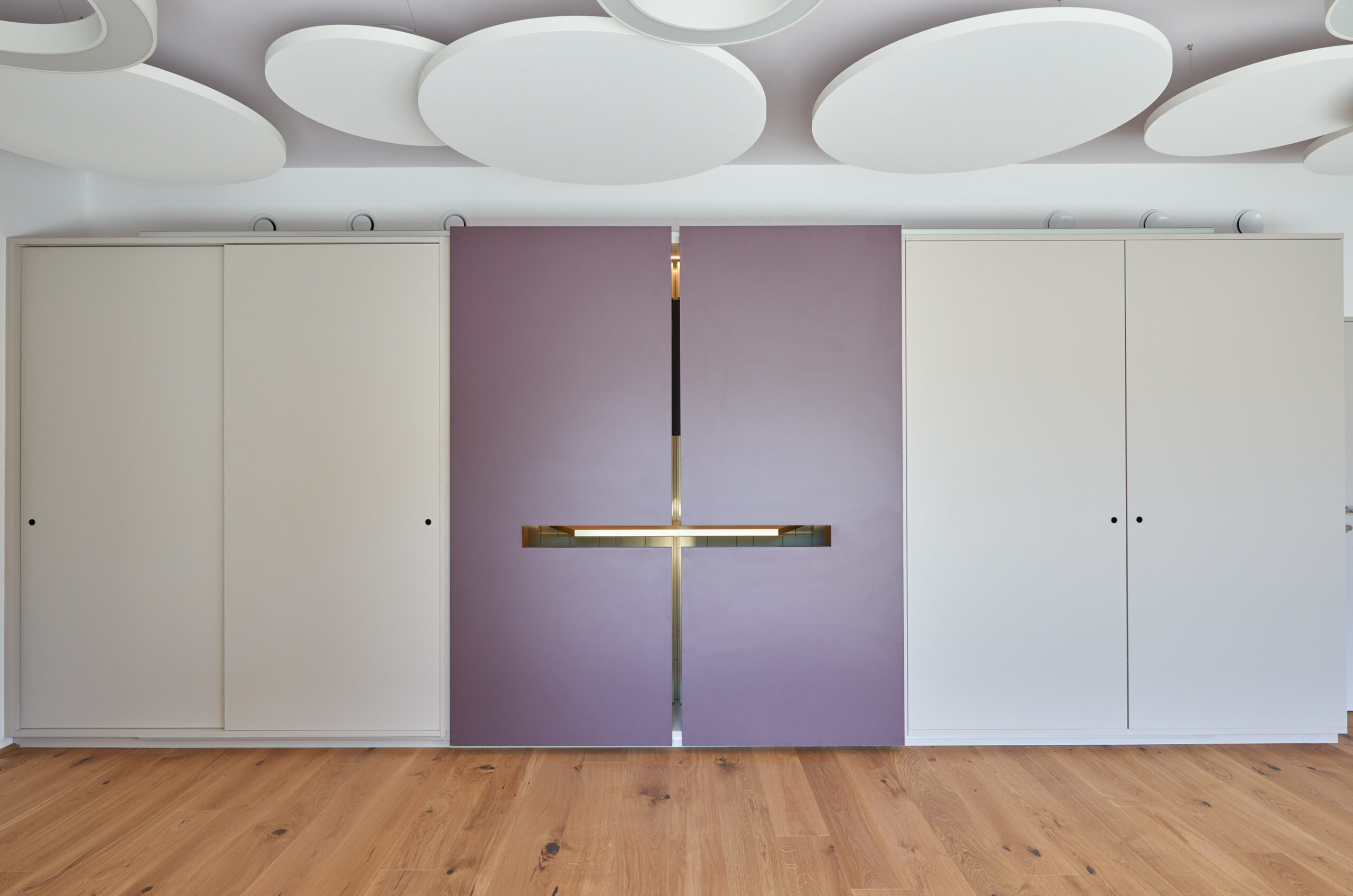 Die sakrale Wand nimmt sich den klassischen Flügelaltar als Vorbild und baut Schicht um Schicht ein Objekt auf, dass von außen nach innen immer mehr Fokus auf das Innere Ich richtet. Ist die Wand geschlossen, integriert sie sich beinahe unmerklich in den Multifunktionsraum. Wird sie geöffnet, spannen die Flügel einen andersartigen Raum auf, der die gestellte Aufgabe erfüllen möchte.